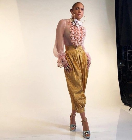 Знаменитая певица и актриса Дженнифер Лопес приняла участие в танцевальном шоу World Of Dance, специально для которого примеряла эффектный наряд. Розовая блуза с цветком и золотистые штаны с блестками были выпущены брендом Gucci.