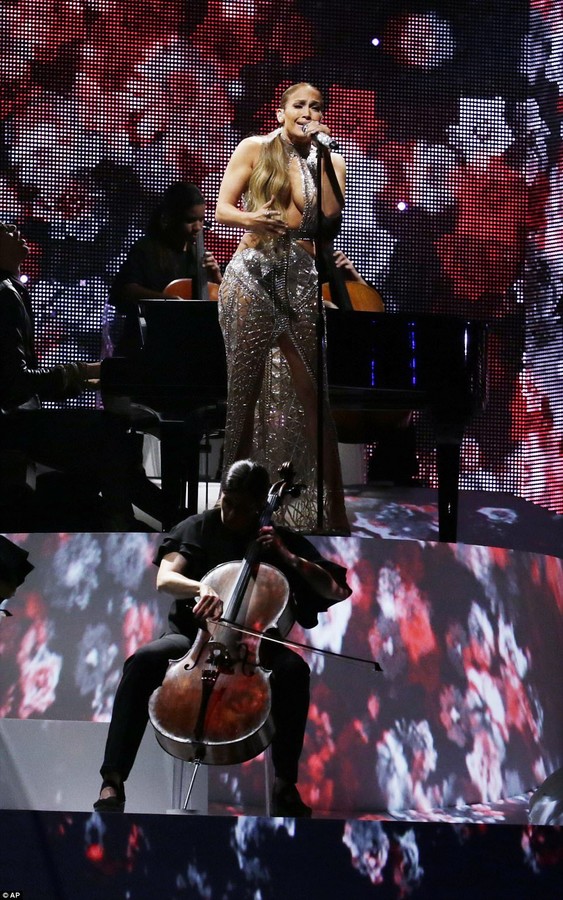 На премии Дженнифер появилась в очень смелом полупрозрачном наряде из осенней коллекции Julien Macdonald, который подчеркнул все изгибы фигуры артистки: разрез до бедра, глубокое декольте, открытая спина. Платье Лопес дополнила серьгами от Lynn Ban и босоножками на шпильке от Jimmy Choo.