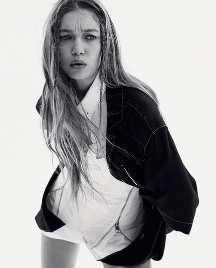 Хадид снялась в комплекте черного белья и прозрачных светлых штанах. Также модель снялась в черном платье с шифоновым верхом без бюстгальтера. Обнаженную грудь звезда прикрыла прядями волос.