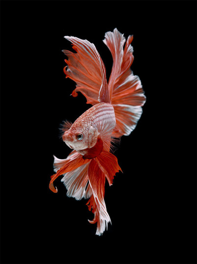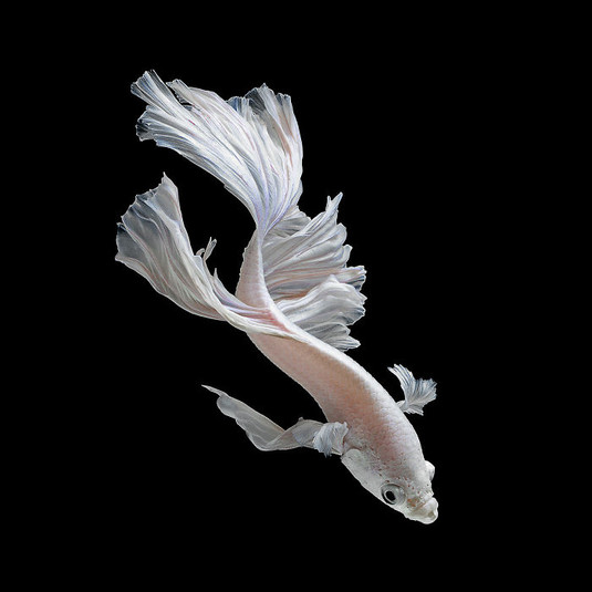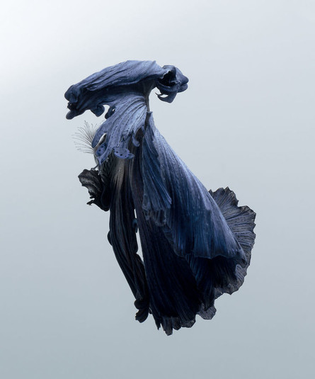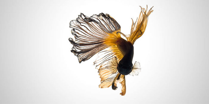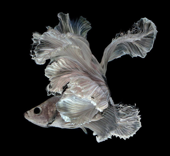 На фоне контрастов белых и черных фонов он создает фантастические фотографии этих животных, используя кристаллические аквариумы и мощные линзы. Эффект поистине великолепен: превращение рыб в волшебных существ, как будто они парят в воздухе, а не в воде.