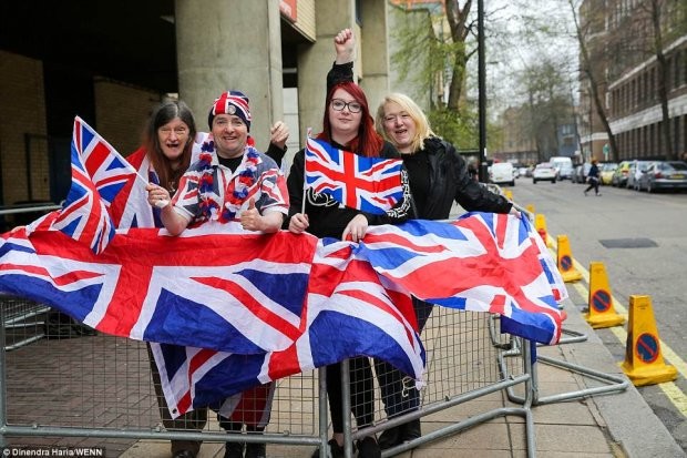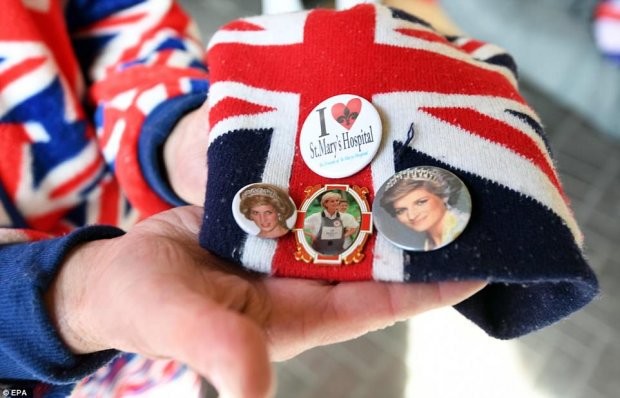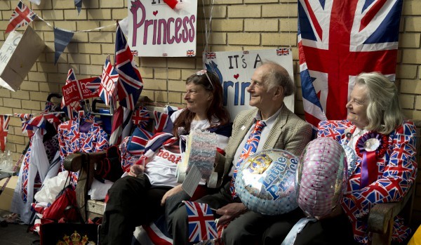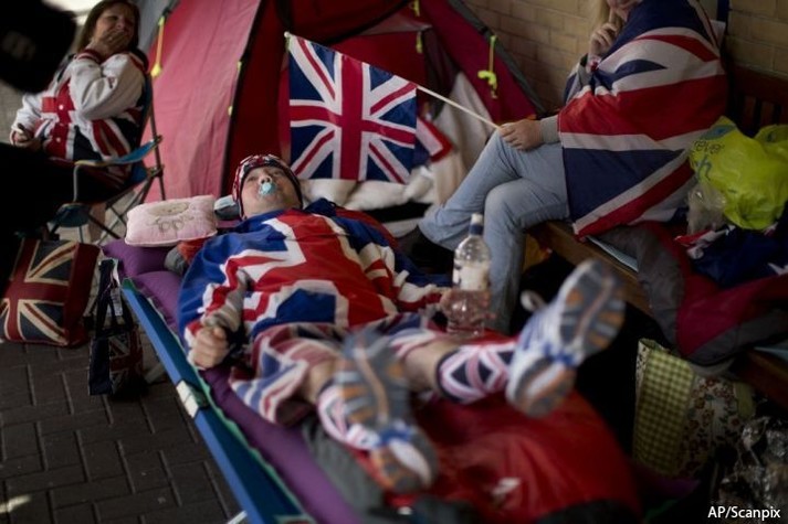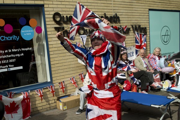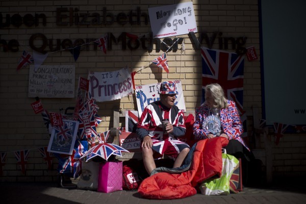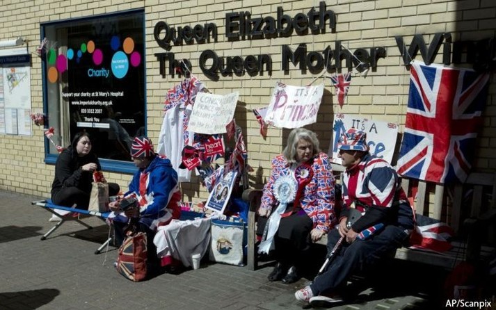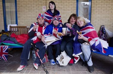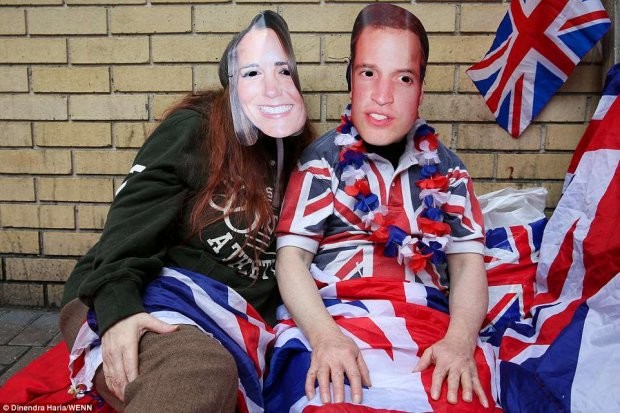 Все поклонниким одеты в цвета британского флага, а также приготовили атрибуты, которые нужны молодым родителям: соски, пеленки, колясочки, а некоторые даже принесли картины с изображением беременной Кейт.