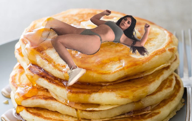 Некоторых пользователей сети неестественная поза Кардашьян вдохновила на создание мемов. Они стали хитом. Теперь ее изображают на стопке блинов и не только.