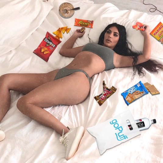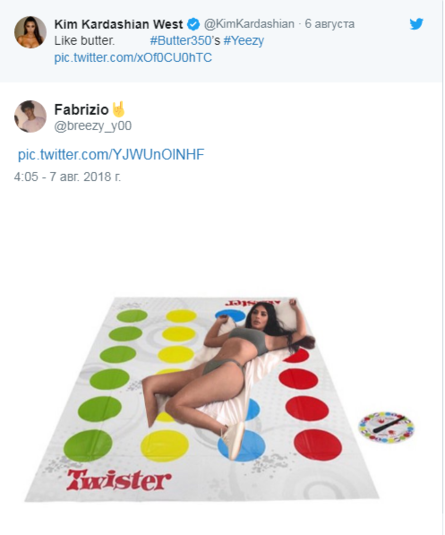 Стоит отметить, что этот снимок сделали во время рекламной фотосессии кроссовок Yeezy мужа Кардашьян Канье Веста. Кардашьян на фото лежит в кроссовках цвета «Butter» в такой странной позе, что даже подпись к фото — «Like butter» — кажется двусмысленной: перевести эту фразу можно и как «Мне нравится этот цвет», и как «Лежу как масло».
