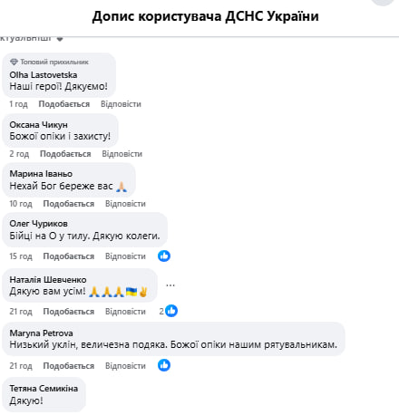 «Щиро дякую за вашу працю та відданість. Нехай береже Вас Господь». - «Дякую ДСНС. Герої без зброї. Господи бережи найкращих».