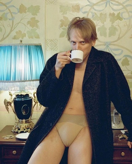 Еще на одном фото Холберг запечатлен в бежевых трусах и сером пальто, надетом на голое тело.