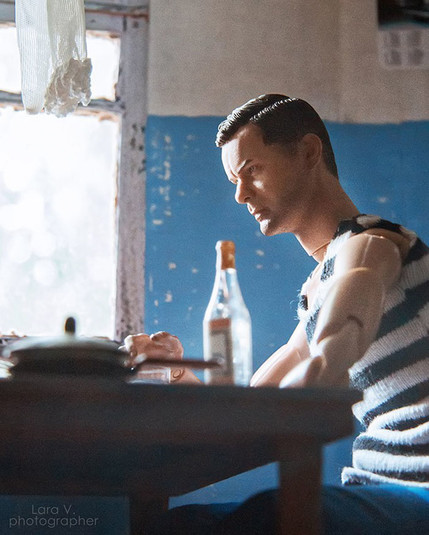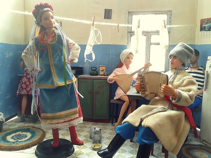 Художник одел Барби в типичный советский халат и переселил ее в коммуналку. Теперь ей приходится готовить своему некогда гламурному мужу на старой, грязной плите. Кен облачился в тельняшку и обзавелся бутылкой водки.