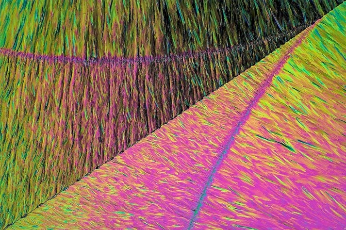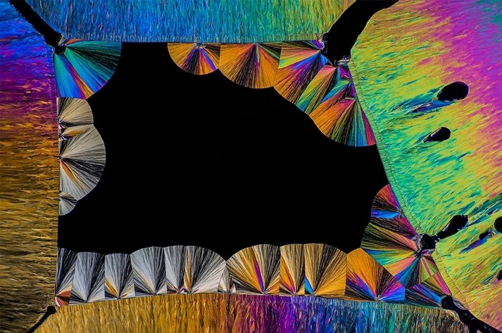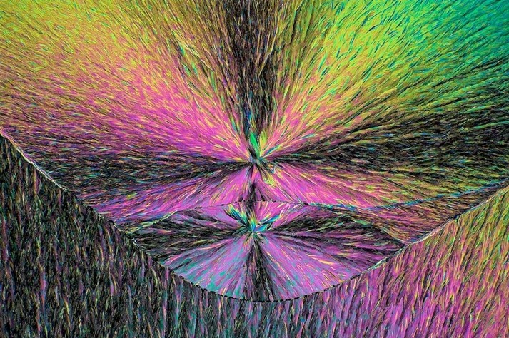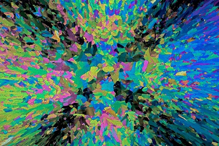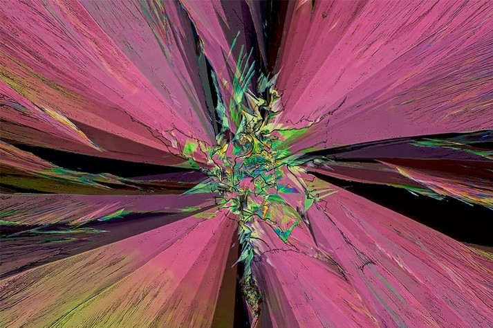 После завершения кристаллизации фотограф помещает стекло под поляризационный микроскоп Jenalab с камерой Sony Alpha 7. С каждой заготовки он получает сотни фотографий в масштабе 120:1.