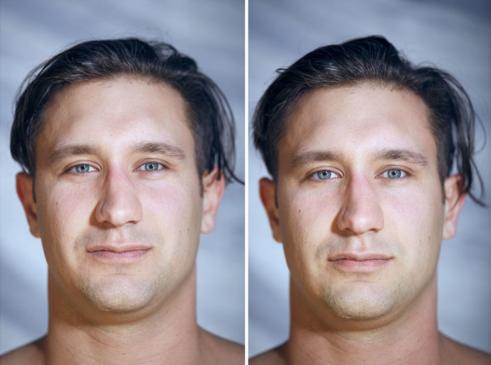 Для чистоты эксперимента фотограф не сообщает зрителям, где человек позирует голым — слева или справа, и предлагает нам самим угадать это, ориентируясь только на мимику моделей.