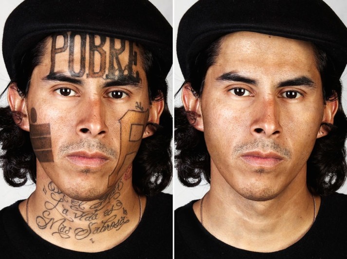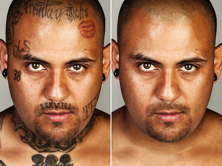 Фотограф Стивен Бартон из Лос-Анджелеса обработал портреты бывших членов уличных банд так, чтобы сравнить их лица с татуировками и без них.