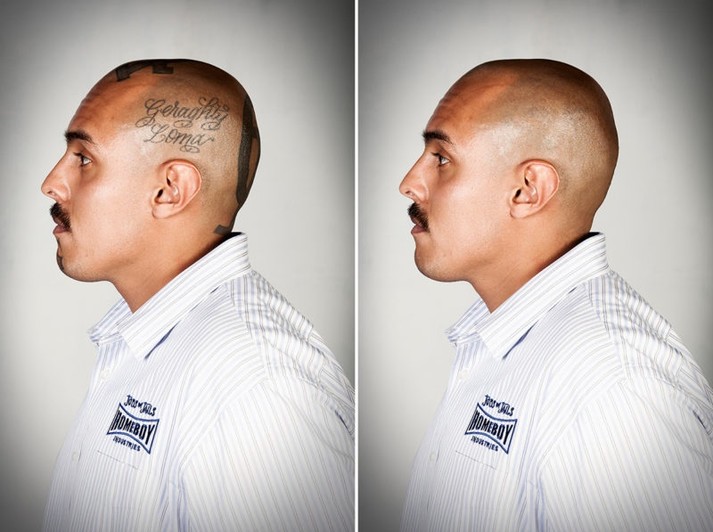 Бартон нашел в интернете фотографии людей с татуировками на лицах, убрал их в Adobe Photoshop и показал руководителям Homeboy Industries.