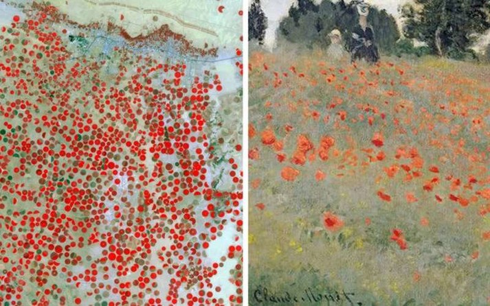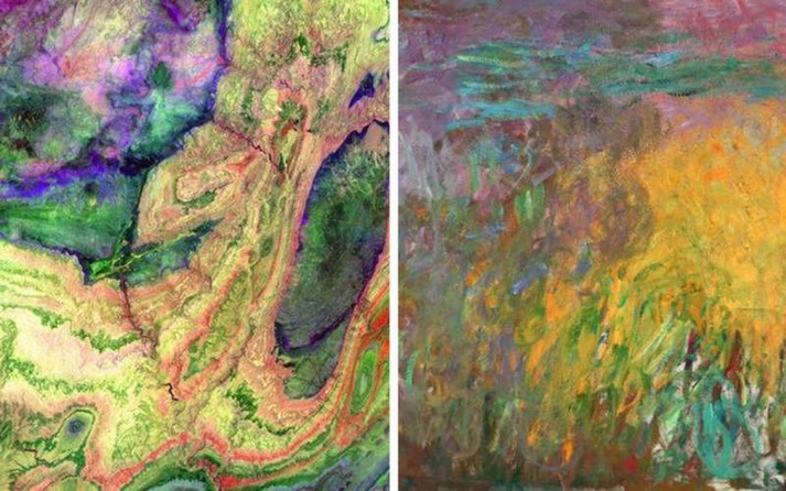 Фотографии, снятые зондом ASTER с орбиты Земли, на удивление схожи с картинами импрессионистов. Чтобы в этом убедиться, взгляните на парные изображения, в которых фото из космоса сопоставлены с полотнами классиков.
