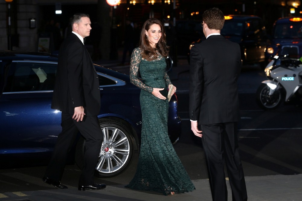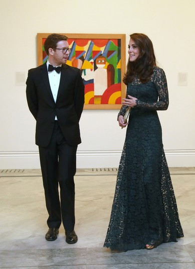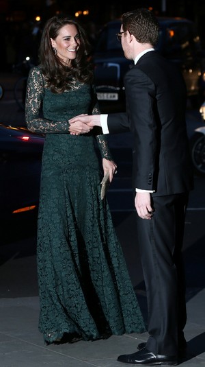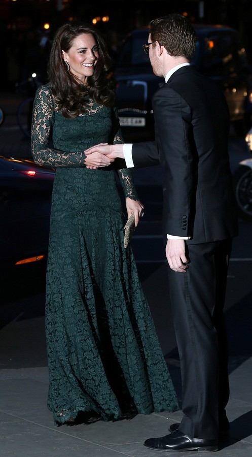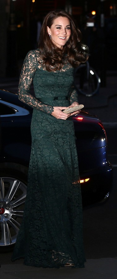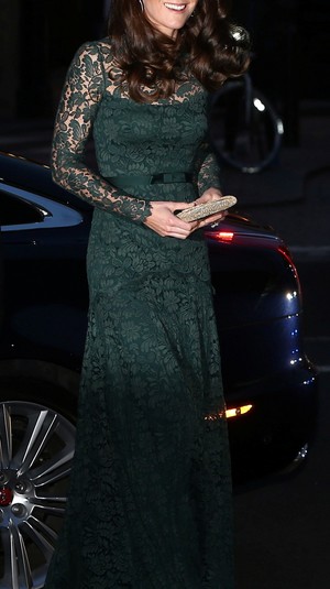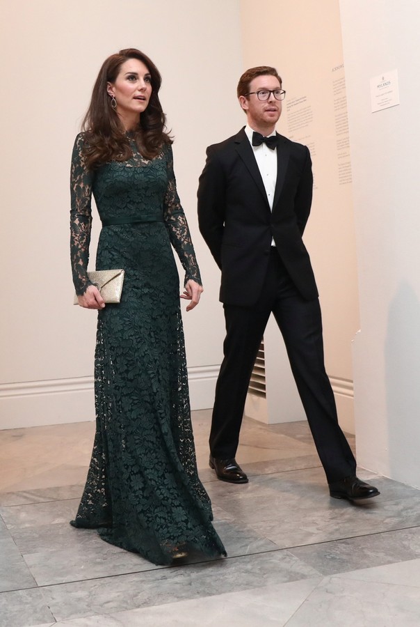 Супруга принца Уильяма выбрала для визита темно-изумрудное кружевное платье в пол от британского бренда Temperley, дополнив его блестящим золотым клатчем и сережками от английского ювелирного дизайнера Kiki McDonough.
