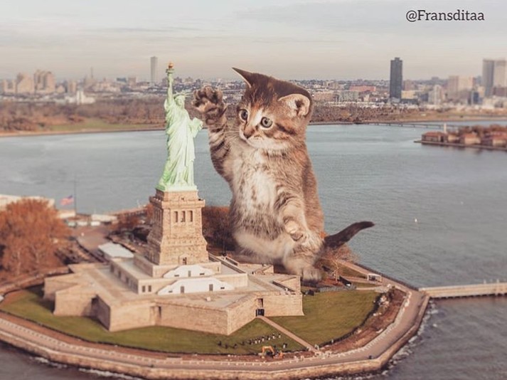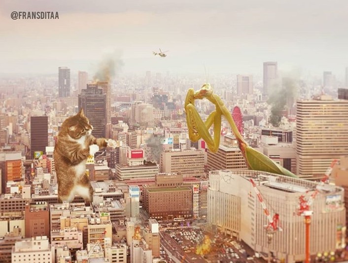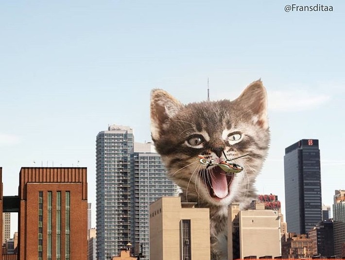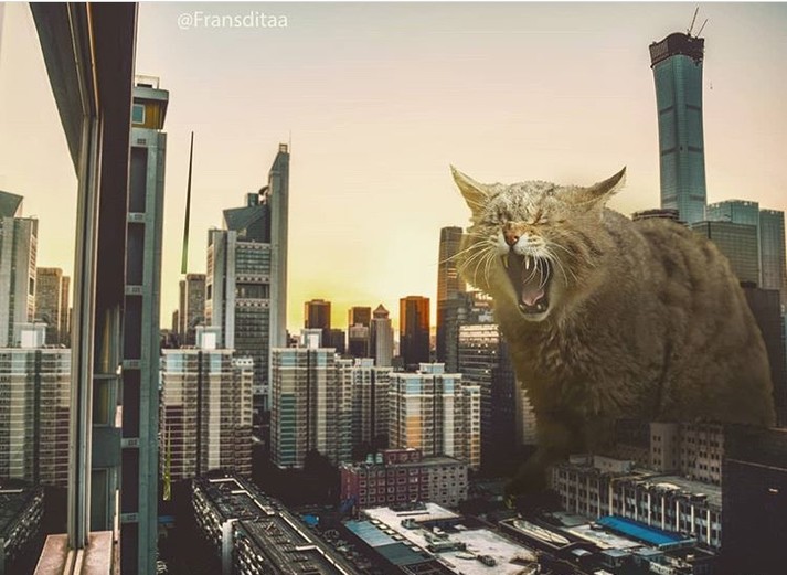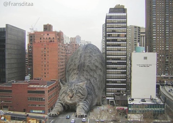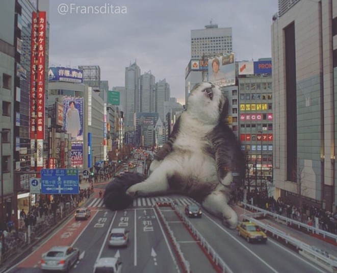Автор называет их «Котзилла», по аналогии с известной разрушительной рептилией Годзиллой. На этих снимках кошки лазят по зданиям, лежат на автострадах, перегораживая путь машинам, и просто прогуливаются по улицам, стараясь не раздавить людей размером с муравьев.