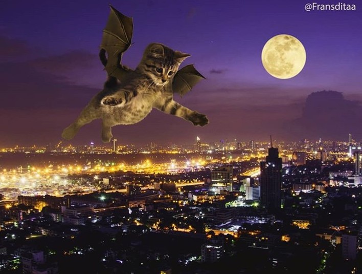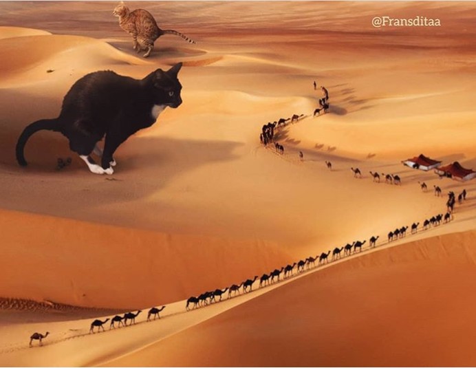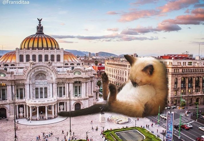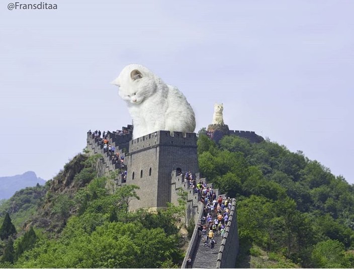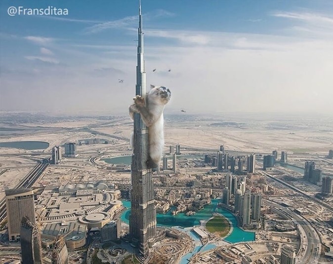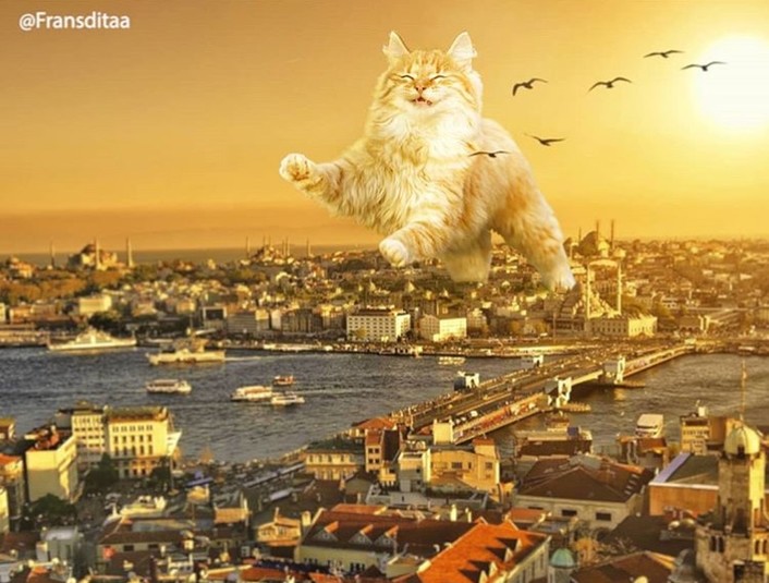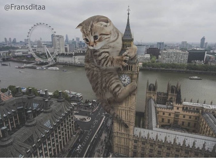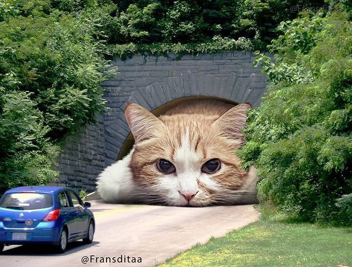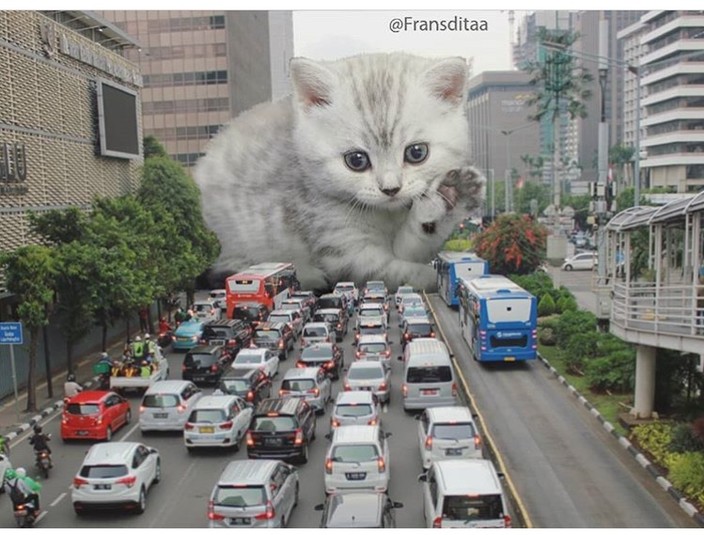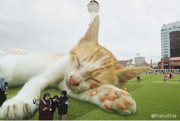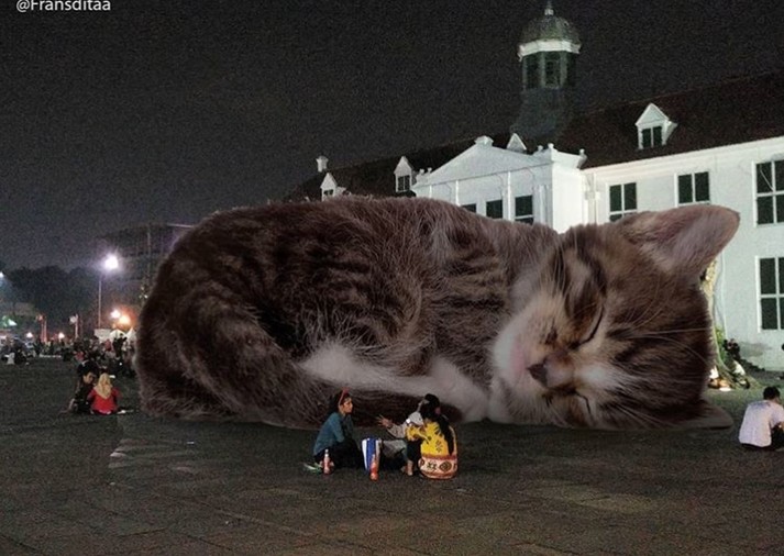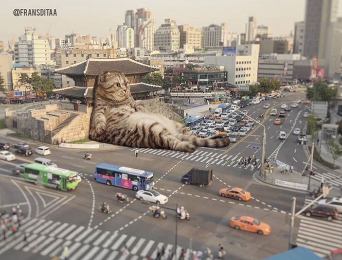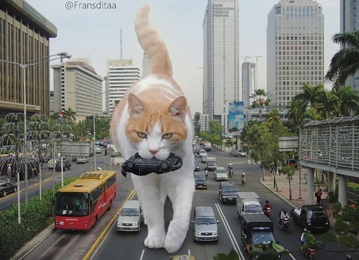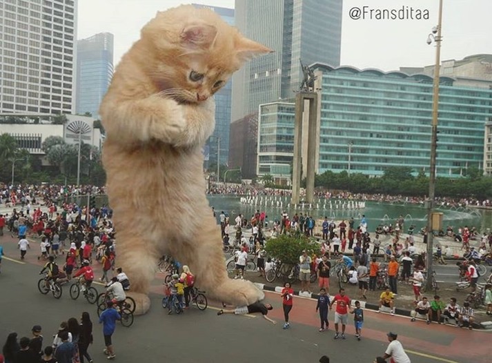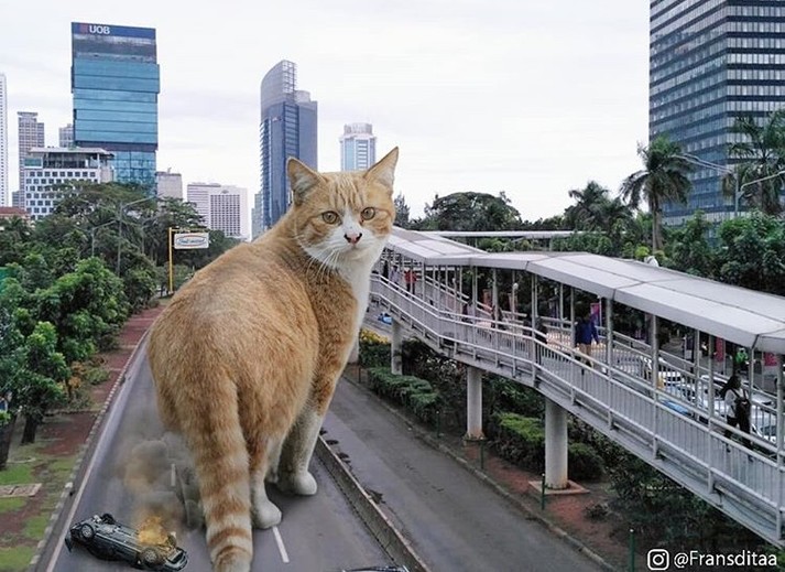 Художник Франсдита Муафидин публикует в своем Instagram фотографии огромных кошек, которые органично вписаны в городские пейзажи.