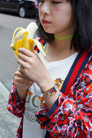 На фотографиях можно увидеть пару, которая делает селфи, девушку, которая ест банан, руку, которая ловит такси, много вилок и голубей. Главным элементом снимков являются часы Gucci на запястьях героев. По словам Парра, вписать часы в общую картину было не самой легкой задачей.