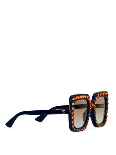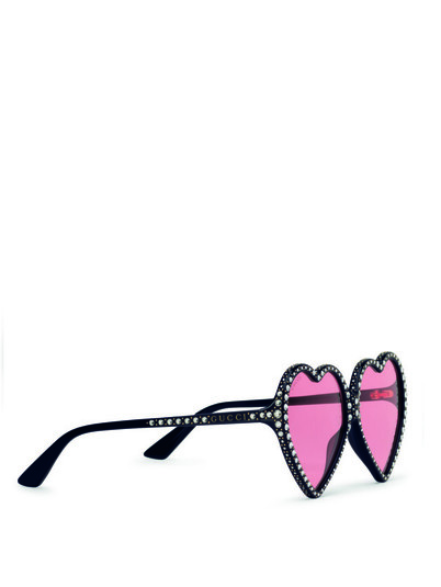 Стекла первой модели солнцезащитных очков выполнены в виде сердец – любимой формы музыканта. Модель состоит из блестящей темно-синей оправы, украшенной кристаллами Swarovski, и массивных вишневых линз. Вторая пара – крупная квадратная модель с блестящей сплошной синей рамкой, украшенной кристаллами Swarovski оранжевого оттенка, и градиентными линзами им в тон.