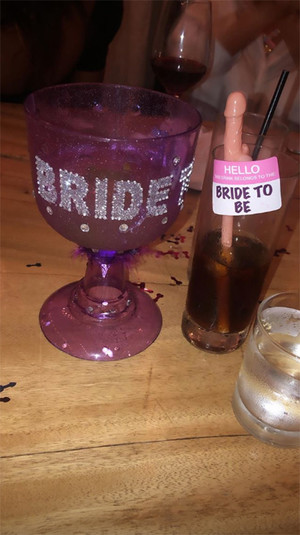 Болдвин надела для девичника обтягивающее белое платье и фату. Также на пальце звезды видно обручальное кольцо с большим бриллиантом. На вечеринке звезды пили из бокалов, украшенных кристаллами Swarovski и стаканов и соломинок в виде пениса.