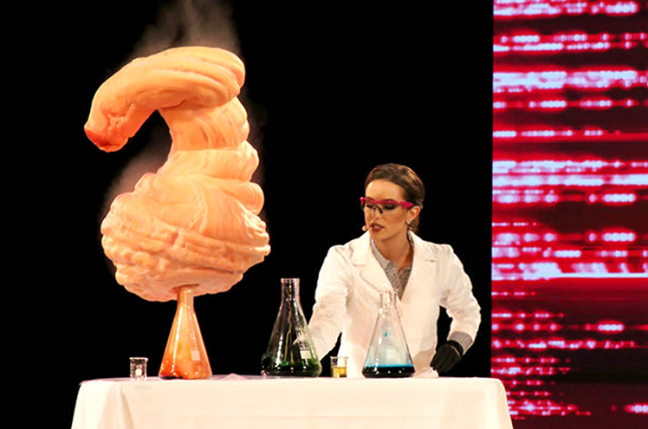 Шриер показала, как разлагается перекись водорода. Зрелище сопровождалось взрывами, фейерверками и яркими всплесками химических веществ.