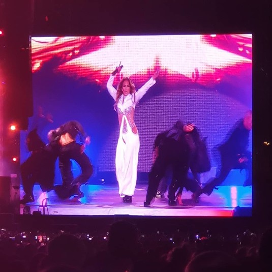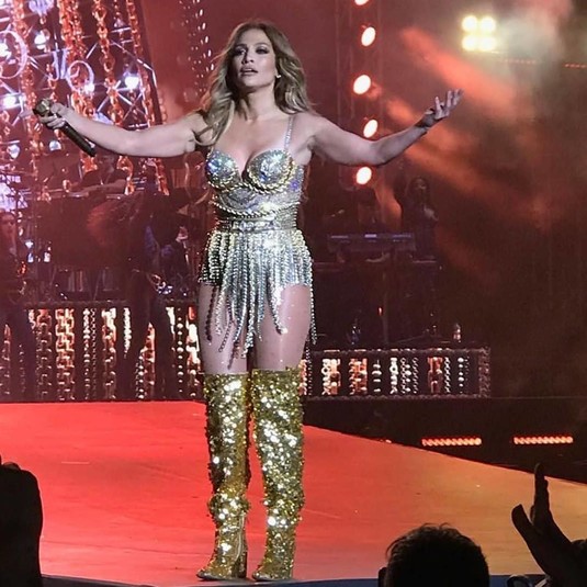 Сначала на сцене Yarkon Park звезда появилась в полупрозрачном облегающем комбинезоне, расшитым камнями и стразами. Наряд с глубоким декольте и нарочито оголенной ногой подчеркнул подтянутое тело Джей и эффектно переливался под софитами во время выступления.