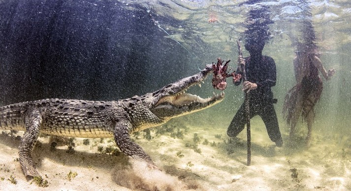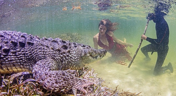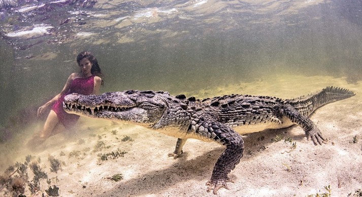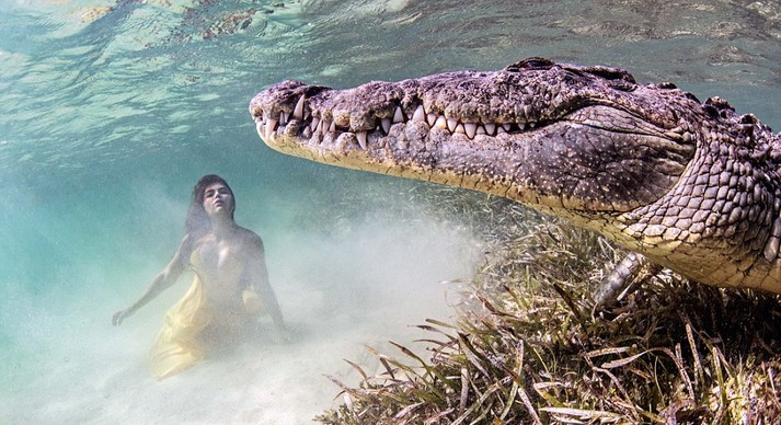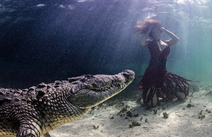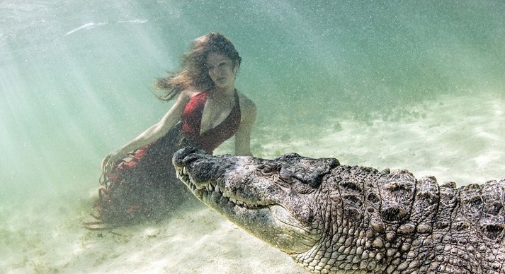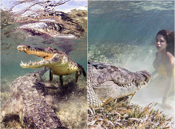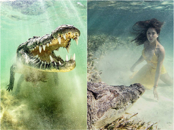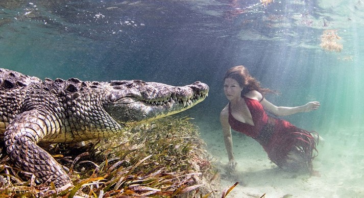 Фотограф Кен Кифер плыл два часа на лодке с женой Кимбер и моделью Мелоди Тревино на остров Банко Чинчорро в Мексике, ради фотосессии с крокодилами. Храбрые модели погрузились в воду и позировали радом с огромными зубастыми рептилиями.