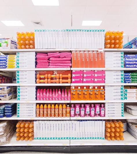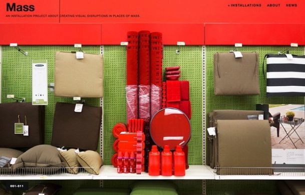 В первом он создает яркие инсталляции из одноцветных товаров, найденных в супермаркетах и других публичных пространствах, во втором — наводит порядок на полках магазинов так, чтобы они образовывали симметричные узоры.
