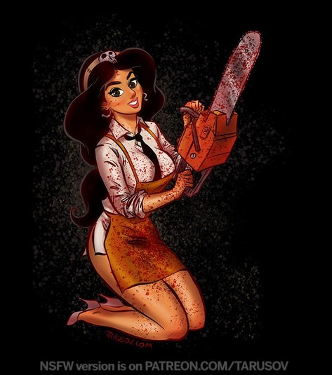 Кто бы мог подумать, что милая Жасмин так гармонично будет смотреться с бензопилой в руках. Предлагаем вам взглянуть на этих ужасных красоток. Но детей лучше от экранов убрать.