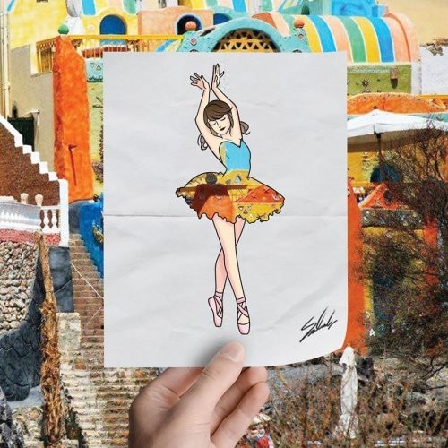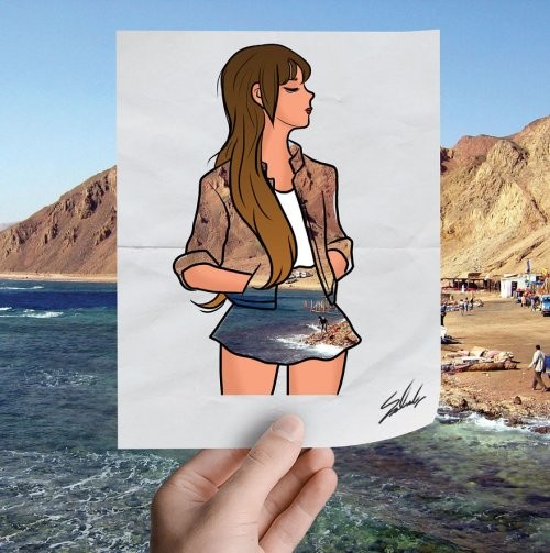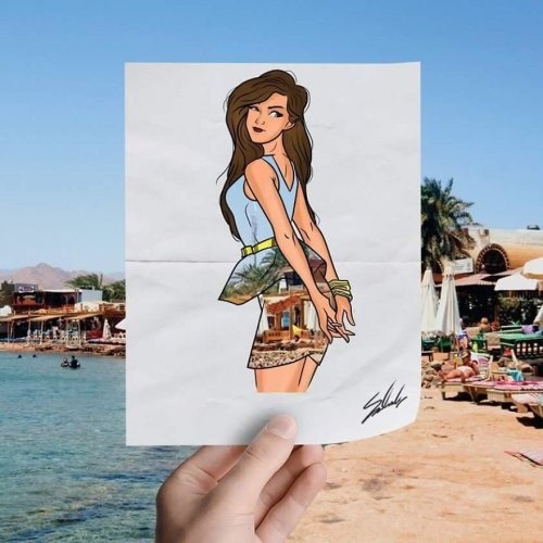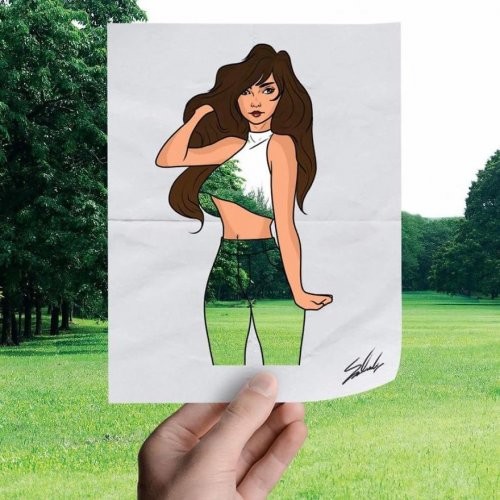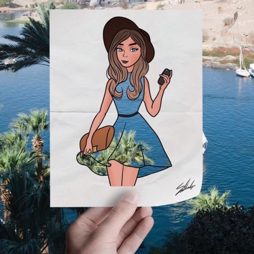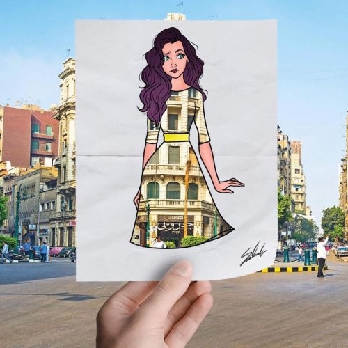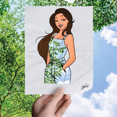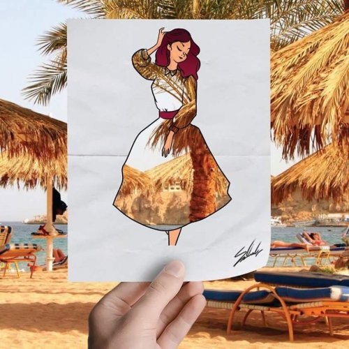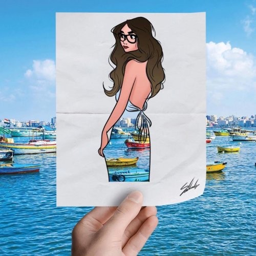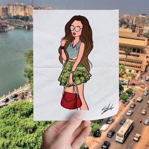 Художник избрал для фотографий нарисованные картинки на обычной белой бумаге. Мохаммед Салах нарисовал девушек в стильном наряде. Египтянин намеренно не добавлял цветов в одежду красавиц, чтобы красота природы сделала это за него.