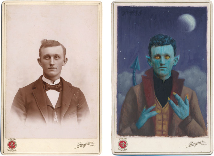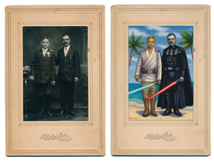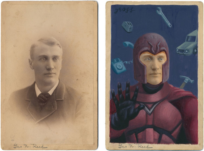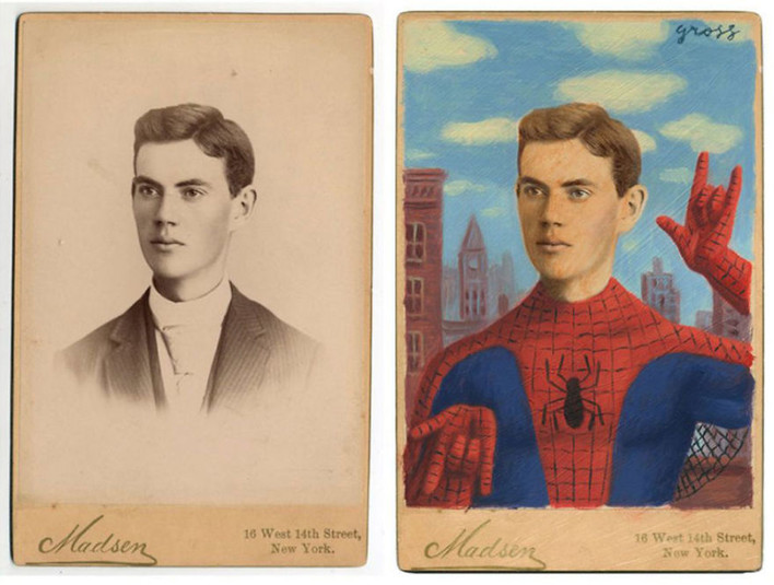 Используя старые черно-белые фотографии в качестве вдохновения, он рисует портреты, на которых мужчины, женщины и дети прошлого превращаются в ретроверсии супергероев, злодеев и знаменитых персонажей поп-культуры.