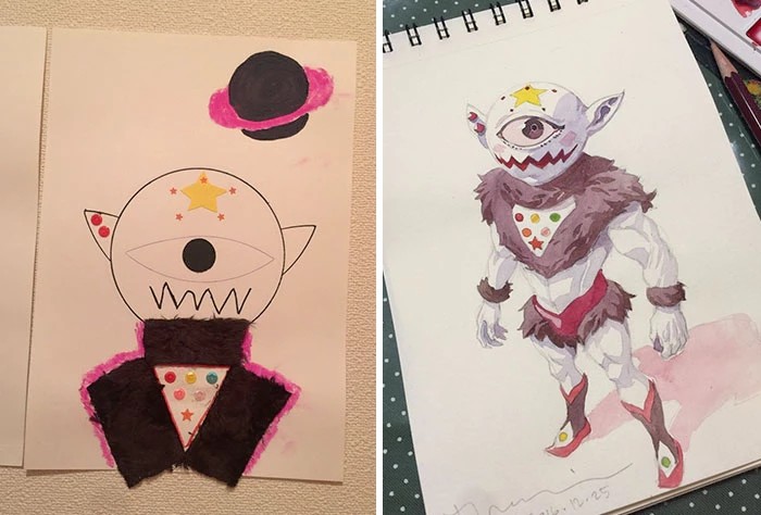 Том берет за основу придуманный детьми концепт и перерисовывает иллюстрации более профессиональным образом.