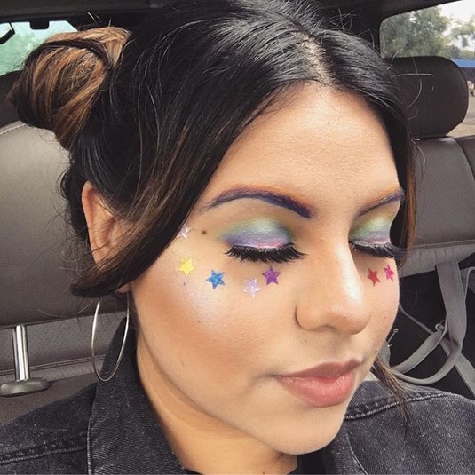 Сочетать радужные брови можно как с простым макияжем, так и с не менее экстравагантным, что и они сами. К ним некоторые добавляют радужный хайлайтер, а также радужные накладные ресницы.