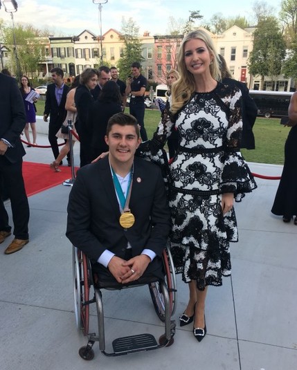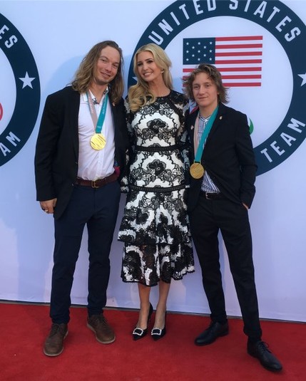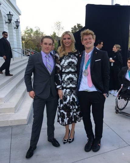 Этот образ она дополнила черными туфлями и распущенными волосами. Иванка активно фотографировалась с победителями и призерами Олимпийских игр. Мероприятие проходило в Duke Ellington School of the Arts в Вашингтоне.