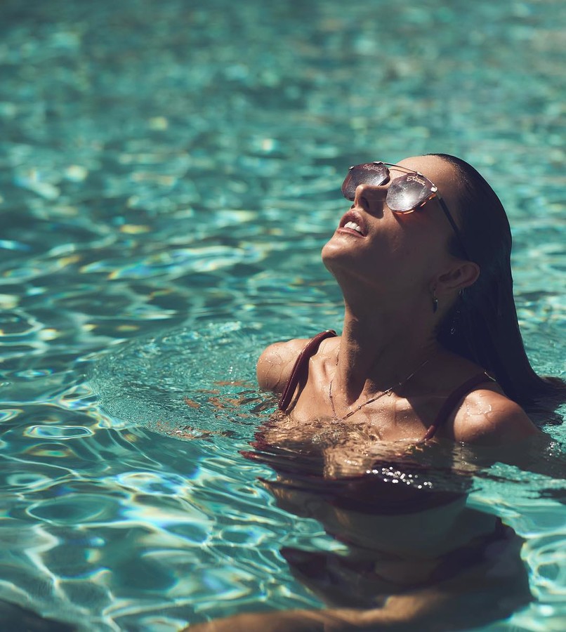 Девушка позирует на фоне массивных инсталляций, которые украшают фестиваль. Также она появляется на снимках в компании своих коллег и подруг. На некоторых фото она появляется в бассейне.