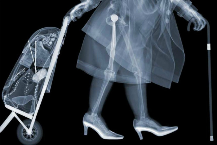 Среднестатистический мужчина в костюме выглядит довольно привычно, а вот его рентген - совсем другое дело. Тем более, мы имеем возможность посмотреть, что же он носит в карманах. Как и в случае с сумкой пожилой женщины. Всегда интересно, что она возит в своем «сундучке». Да, современные художники позволяют заглянуть даже туда.