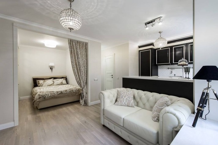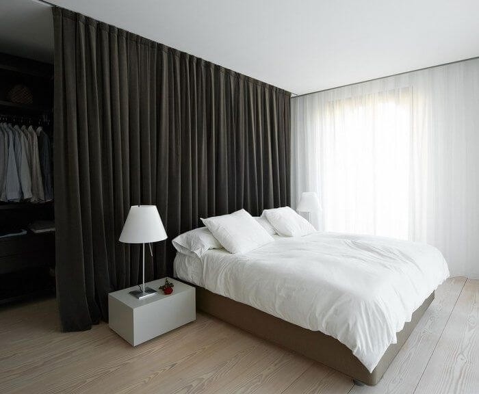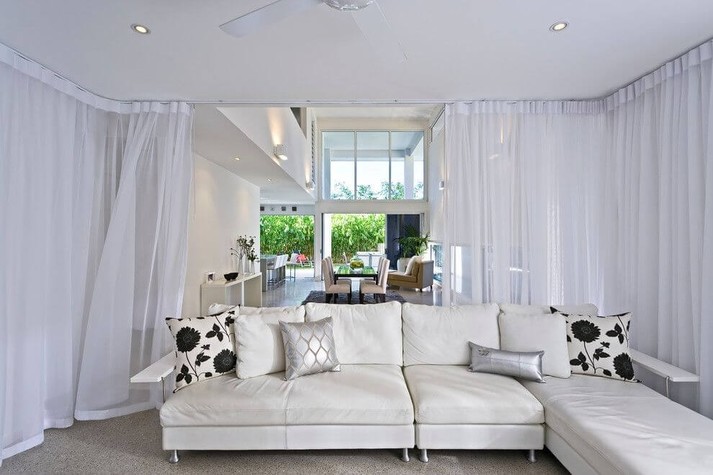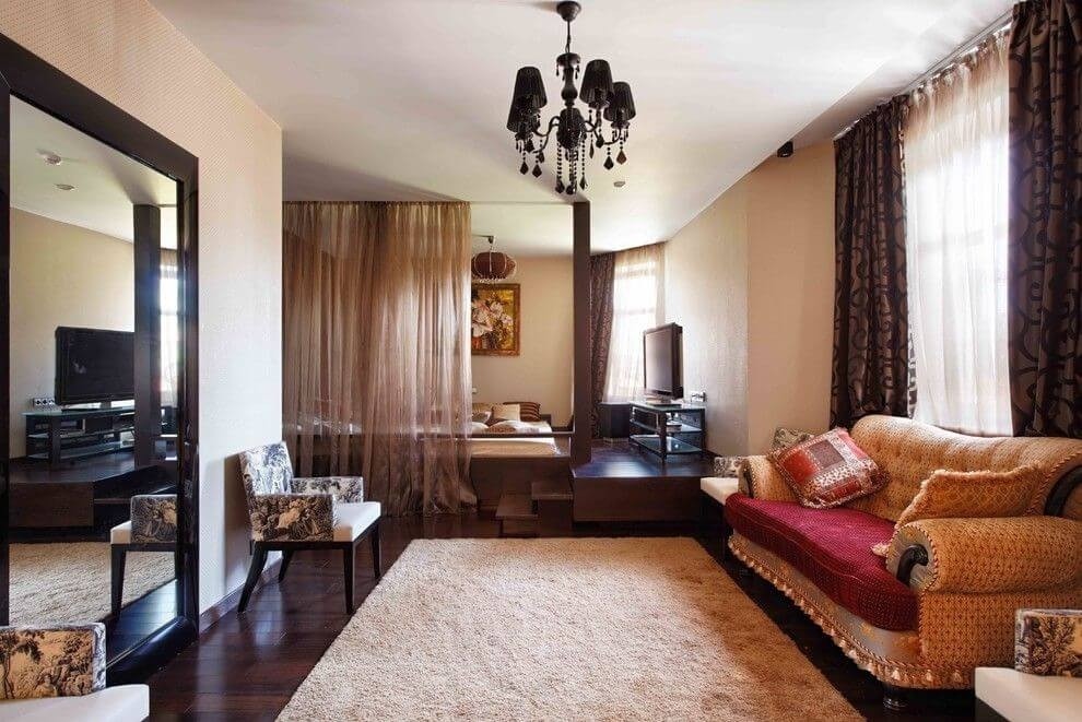 Даже полупрозрачные шторы визуально разделяют пространство большой комнаты