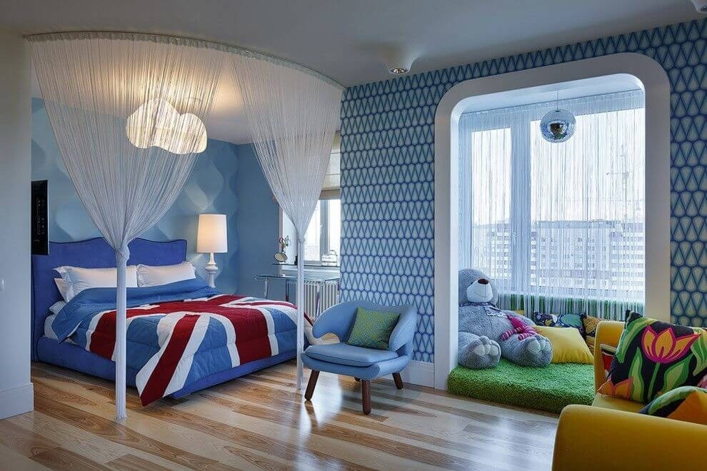 Легкий балдахин разграничивает спальную и игровую зоны в детской комнате.