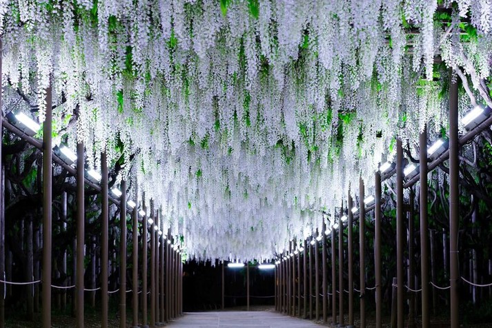 Цветочный парк Асикага в японской префектуре Тотиги, всего в двух часах езды от токийского вокзала на поезде, может похвастаться более чем 350 глициниями, которые год за годом наполняют парк ослепительными красками.