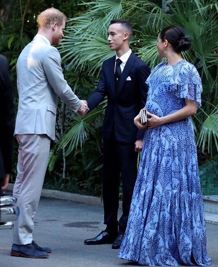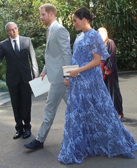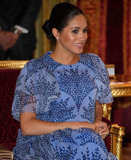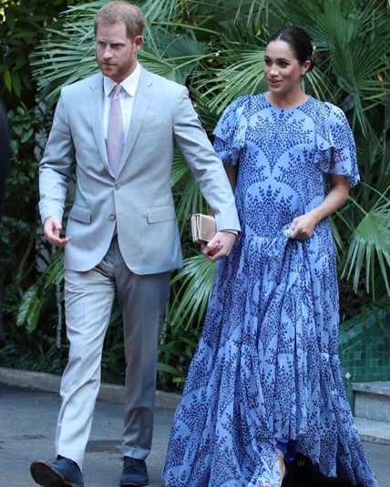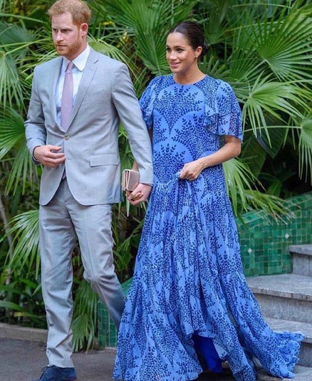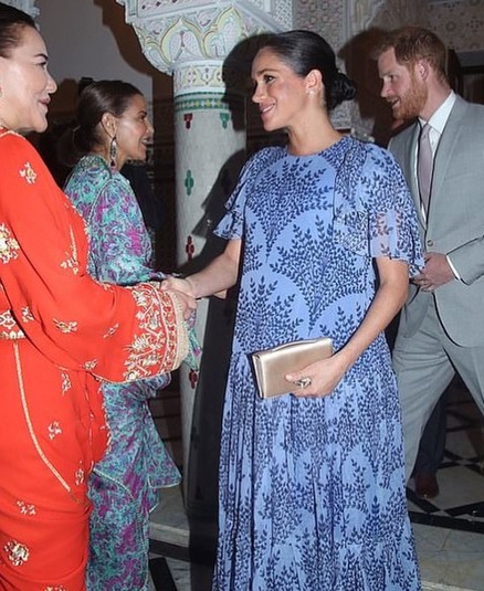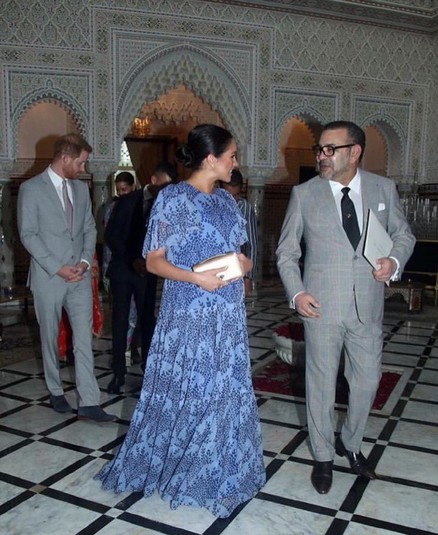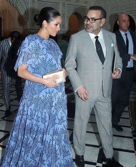 Король Мухаммед вместе cо своими сестрами и наследным принцем Мулай Хассаном встретили почетных гостей во дворце. Меган Маркл для этой встречи выбрала элегантный голубой наряд от Carolina Herrera с растительным принтом. Длинные волосы беременная герцогиня собрала в фирменный пучок, а в макияже использовала румяна кораллового оттенка.