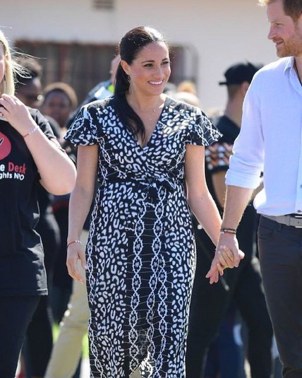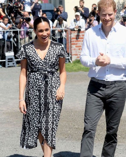 Для прогулки по Андалузским садам супруга принца Гарри выбрала более официальный look: черное платье и белый жакет.