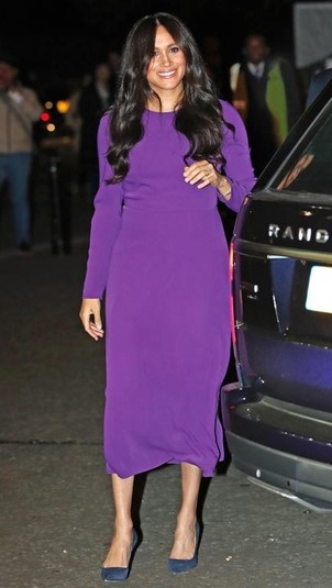 Это платье нежного василькового цвета было третьим нарядом Меган за день. Сегодня утром она была замечена в джинсах, полосатом джемпере и куртке, когда встречалась с молодежью, занимающейся разведением лошадей.