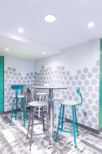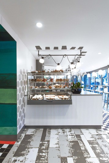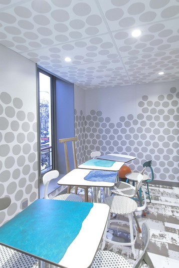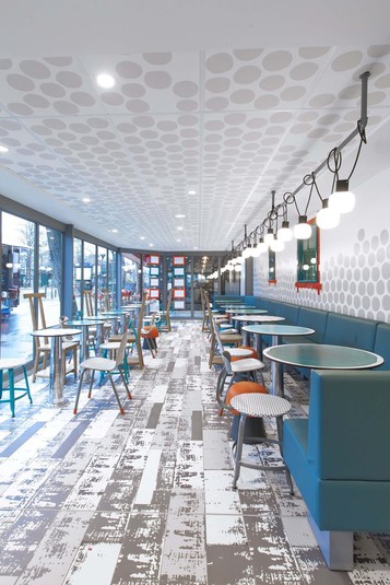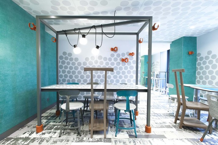 Интерьеры первого в мире дизайнерского Макдональдса выполнены в любимой гамме Паолы: бирюзовой с яркими коралловыми деталями.