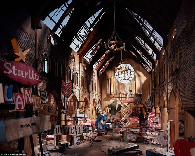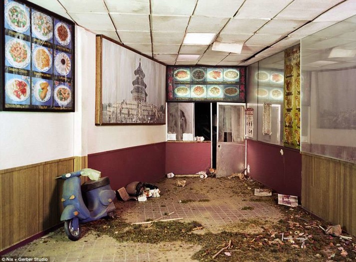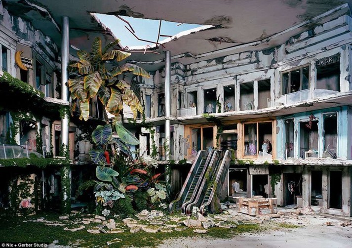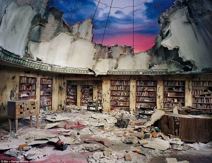 Сейчас Никс живет в Бруклине и использует свой талант в рукоделии и фотографии, чтобы предложить свой ответ на эти вопросы. В этих удивительно подробных сценах — затопленная электростанция, разваливающаяся прачечная, заброшенная библиотека с деревьями, растущими сквозь пол. Каждая миниатюра размером с кукольный домик: 50 × 61 × 183 см. Художница снимает их на пленку, и создается впечатление, что на самом деле это полноразмерные сцены.