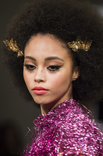 В то время как Ashley Williams сделали ставку на сверкающие заколки с крупными надписями из стразов, а Ashish поместили на головы моделей изящные заколки-бабочки.