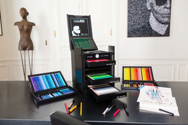 Набор от Лагерфельда включает в себя 350 материалов и инструментов для рисования и живописи, включая цветные карандаши, ручки, графитовые карандаши, кисточки, ластики и точилки. Все это упаковано в огромную деревянную коробку, которая украшена портретом самого дизайнера.