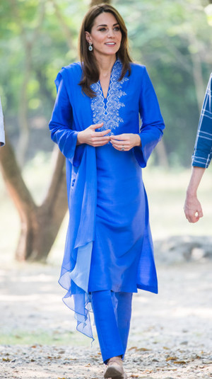Кейт Миддлтон в первые два дня королевского турне выбрала брюки с удлиненной рубашкой с вышивко местного бренда Maheen Khan и бирюзово-белый наряд Catherine Walker, состоящий из платья и брюк с плавным цветовым переходом «омбре».
