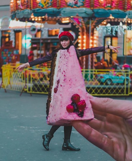 «Так получилось, что мы взяли с собой на прогулку пирог - подкрепиться, и как это обычно бывает: лучшие мысли приходят в самые глупые моменты. Я хотела сфотографироваться у озера, а Виталий в одной руке держал телефон, а во второй – пирог. Положить пирог было некуда, вот так и получилось наше первое фото с едой – я и пирог в виде платья», – рассказывает Полина.