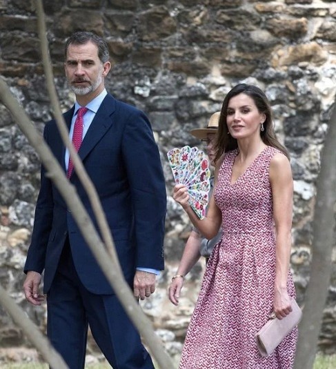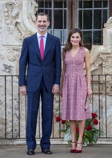 Для официального мероприятия королева Летиция подобрала стильное платье с элегантным принтом и V-образным вырезом. К нарядам супруга испанского монарха подобрала яркие туфли на каблуках. Идеальная укладка волос и нежный макияж завершили стильный «лук» королевы Летиции.