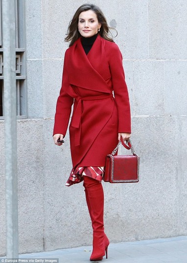 Специально для этого события королева надела юбку-миди от Carolina Herrera и белую водолазку от Hugo Boss. Свой наряд королева дополнила красными сапогами от Magrit.