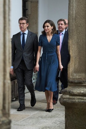 Супруга испанского короля Филиппа VI Летиция приняла участие в презентации цифровых технологий, которая проходила в городе Сантьяго-де-Компостела. Специально для этого мероприятия она выбрала стильное синее платье с ненавязчивой вышивкой. А поверх него она надела приталенное пальто с высоким воротником и широким поясом.