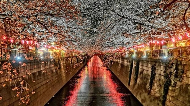 Япония покрылась цветом сакуры. Вишневые деревья зацвели по всей стране и притормозили жизни ее жителей. А в самом центре столицы аллеи с сакурами еще и подсветили розовым, чтобы, создать сказочную атмосферу.