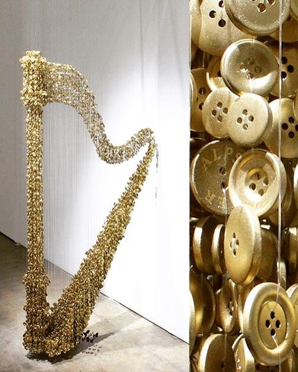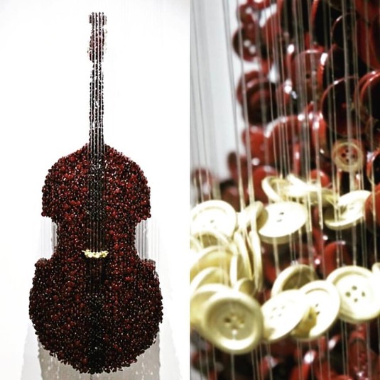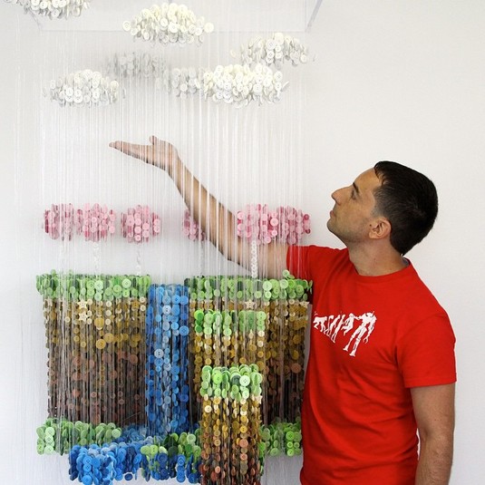 Художник создаёт оригинальные инсталляции, которые состоят из множества пуговиц, подвешенных на тонкие нити.